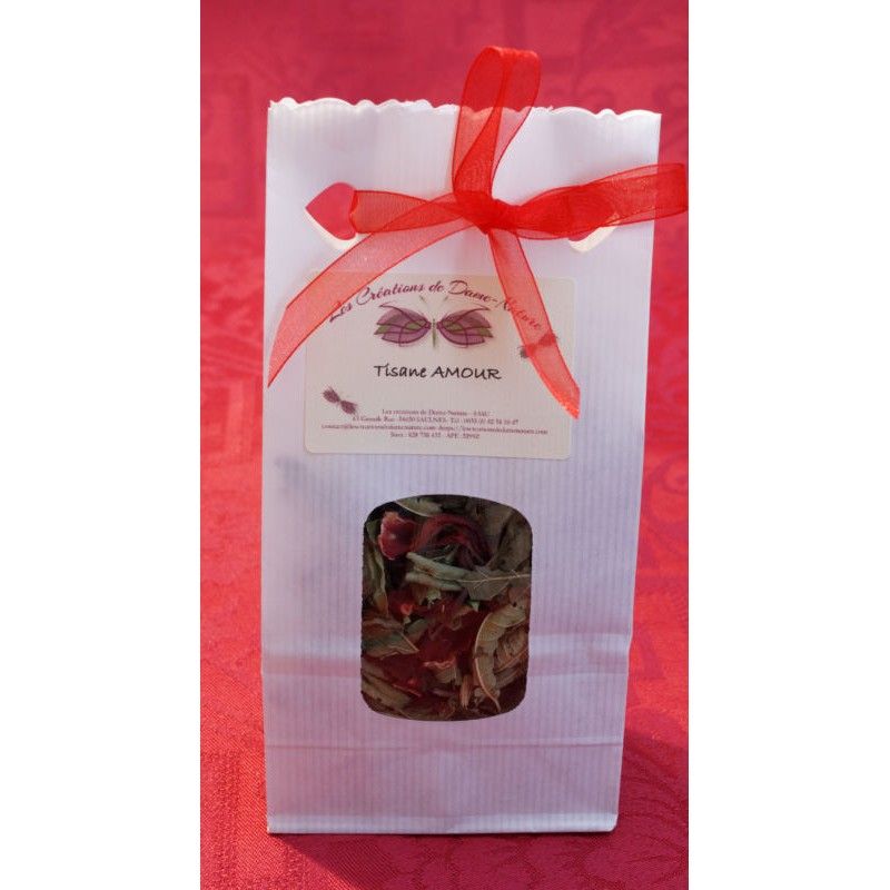 Todo ello en una bolsa blanca con lazo de corazón, papel de seda y porta tisana de arpillera, rosa o margarita.