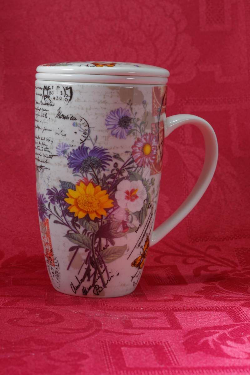 Taza de té de hierbas con diseño de ramo de flores en porcelana 400 ml (Taza - filtro de porcelana - tapa) altura 14 cm x diámetro 8,2 cm
