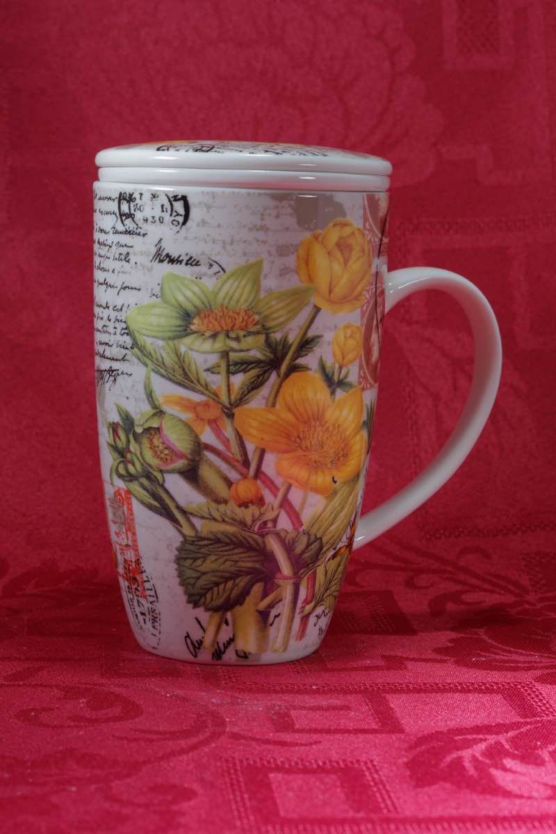 Bonita taza de té de hierbas de porcelana con motivos florales amarillos 400 ml (Taza - filtro de porcelana - tapa) altura 14 cm x diámetro 8,2 cm